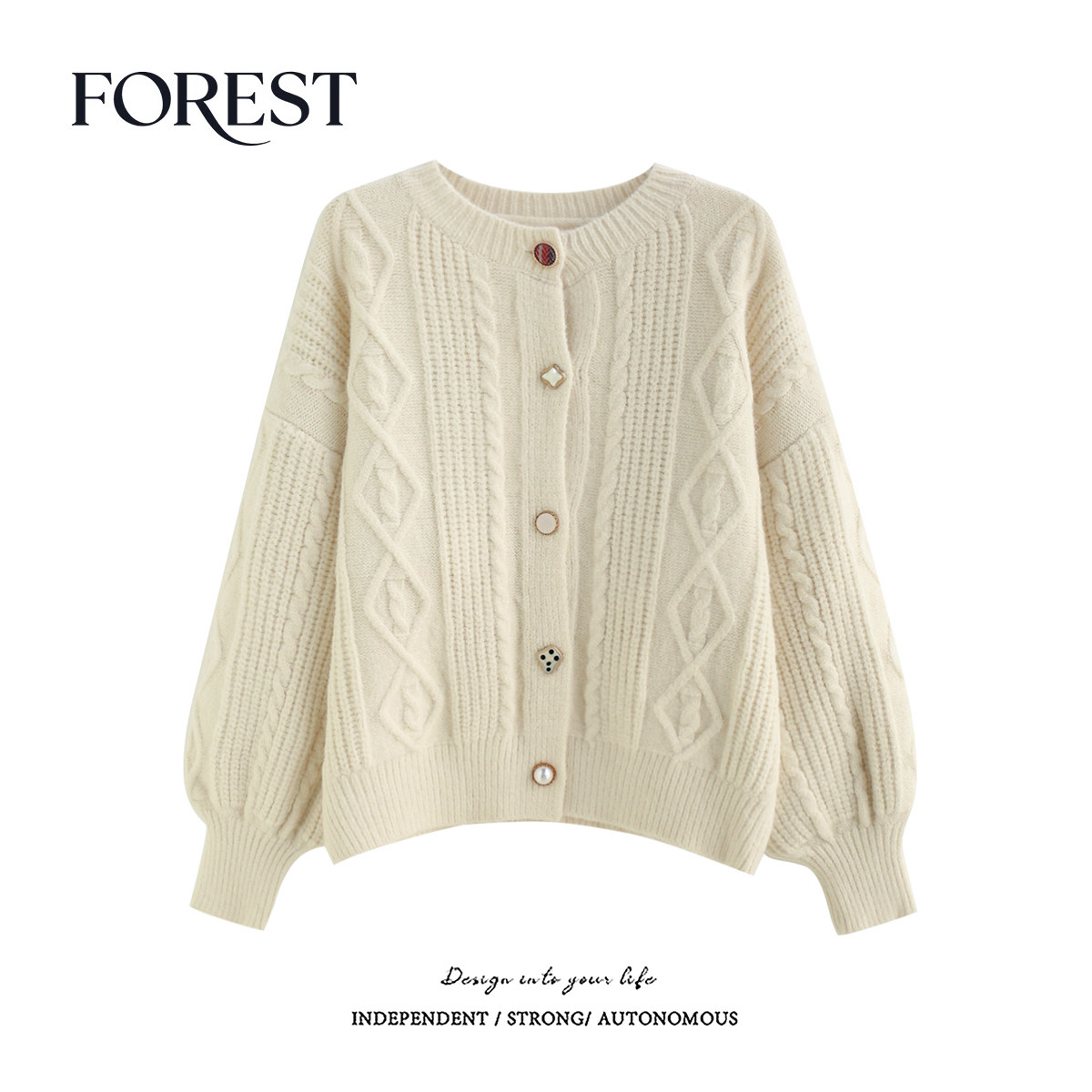 灯笼袖麻花毛衣开衫女外套秋冬新款韩版宽松显瘦短款立领软糯上衣
