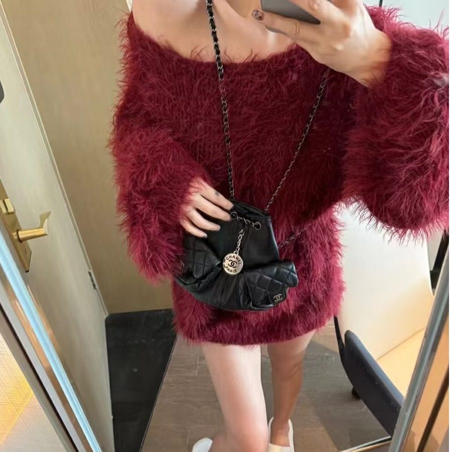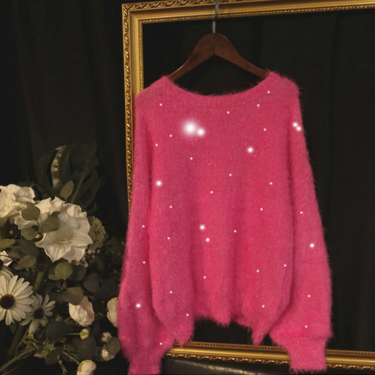 韩版2025秋季新款慵懒风洋气宽松仿水貂绒针织衫灯笼袖露肩毛衣女