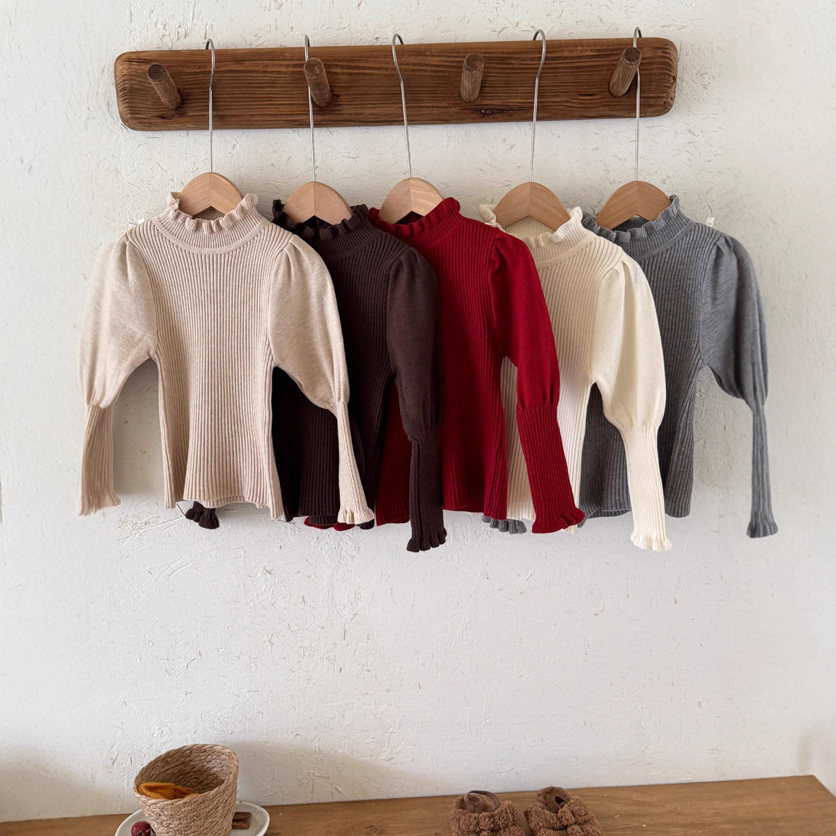 韩系保暖上衣女童秋冬新款韩版纯色花边针织打底衫儿童灯笼袖毛衣