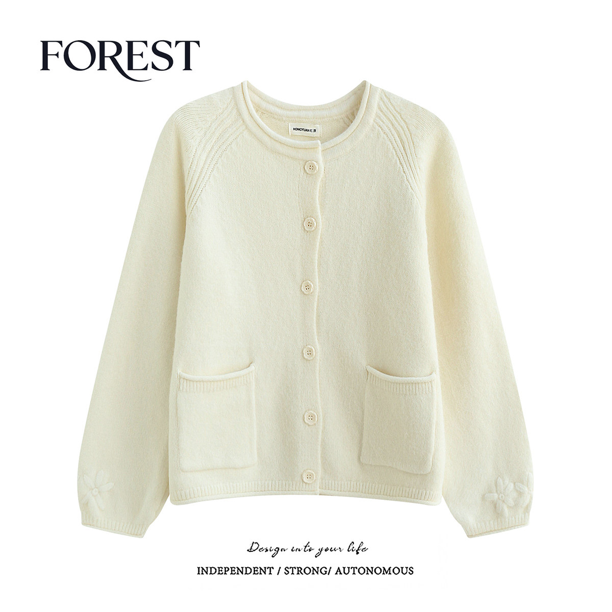 拾野森 冬装新款韩版慵懒风加厚口袋灯笼袖绣花圆领毛衣开衫外套
