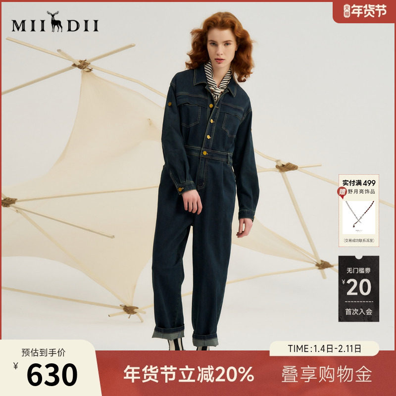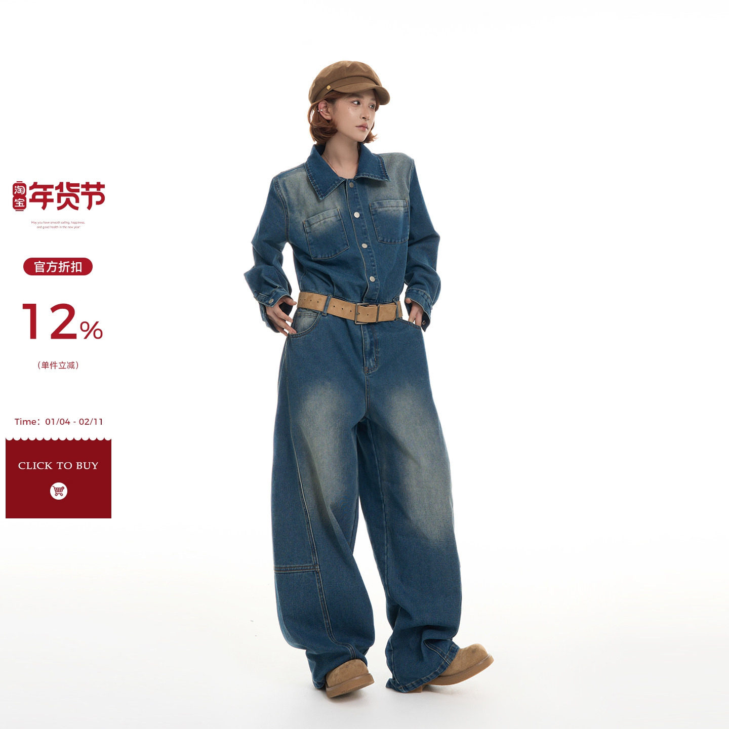 谜底牛仔连体裤女秋季新品复古风时髦宽松直筒长裤243MK1113