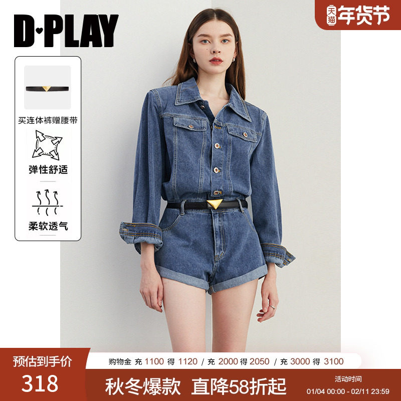 DPLAY蓝色连体裤女春季新款复古收腰通勤高级原色牛仔裤短裤