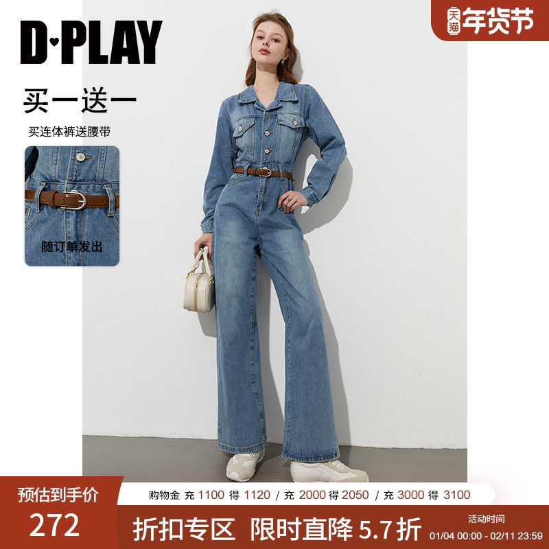 DPLAY2025秋季新款蓝色一体式牛仔连体裤女长袖连衣裤牛仔裤长裤