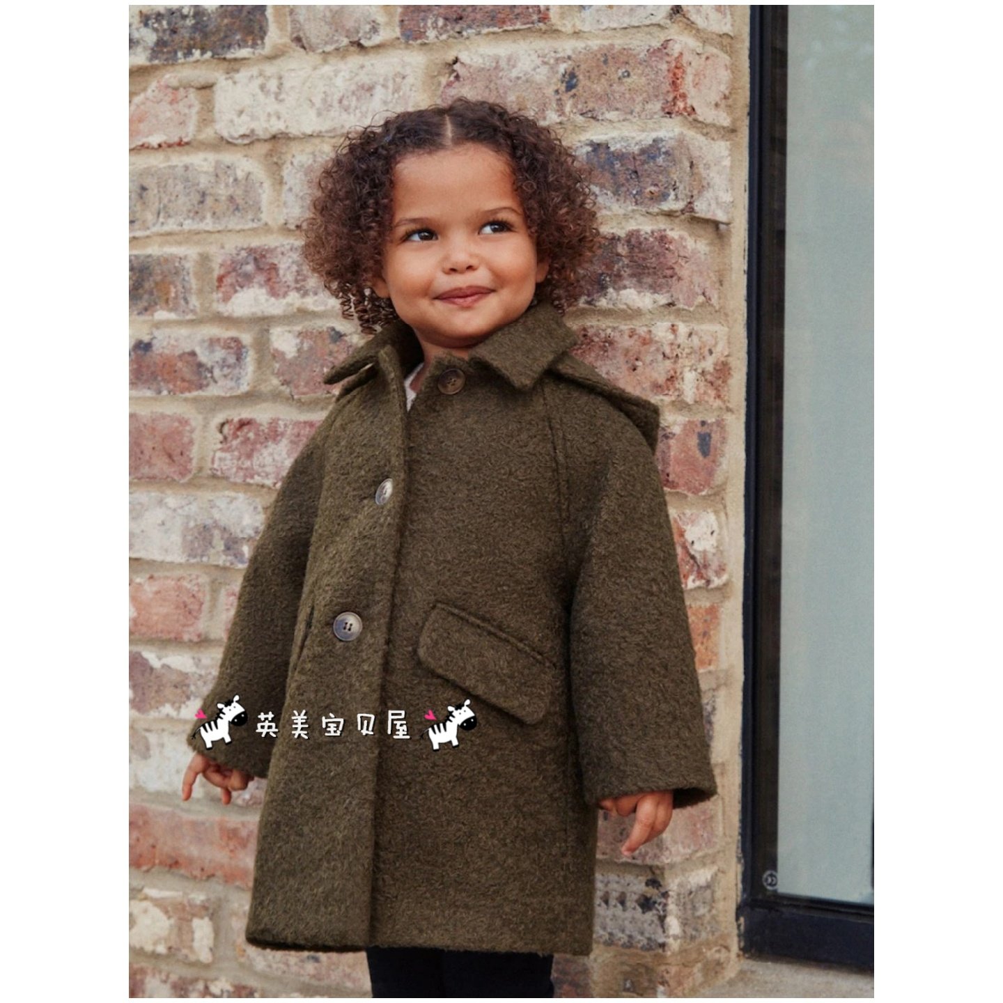 NEXT英国女童装正品25秋冬女宝军绿色复古连帽中长款呢子大衣外套