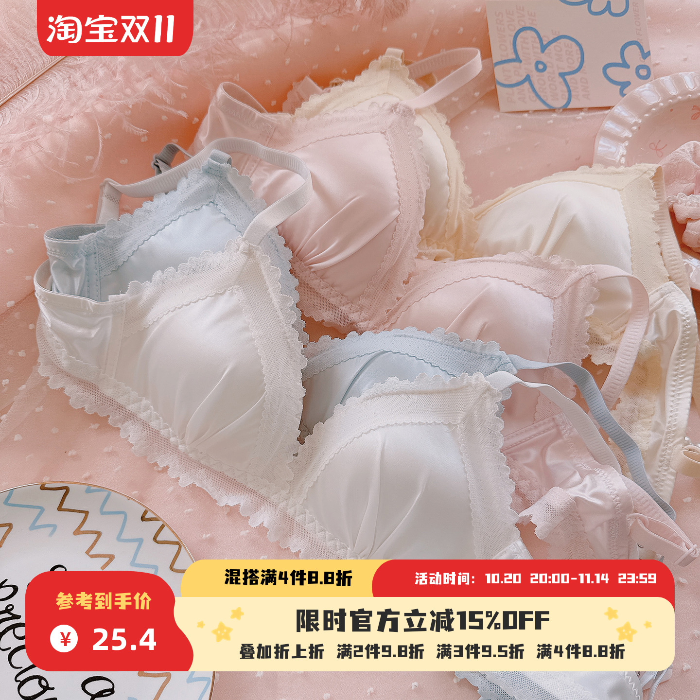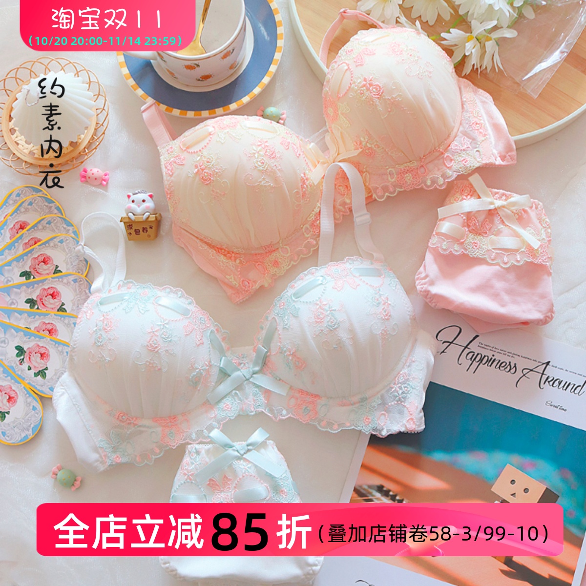 约素 暖秋甜~甜美刺绣蕾丝少女内衣套装纯欲风无钢圈文胸聚拢大码