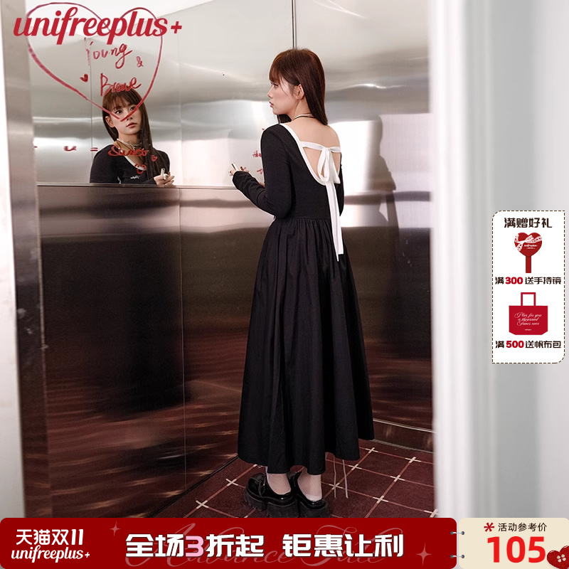 UNIFREEPLUS黑色长袖连衣裙大码女装收腰撞色露背性感蓬松长裙子