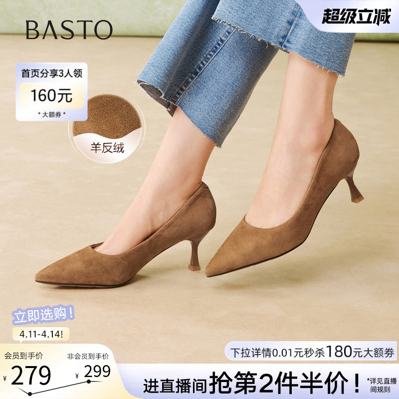 百思图26春商场新款尖头粗跟绒面高跟鞋玛丽珍法式女单鞋W0128AQ6