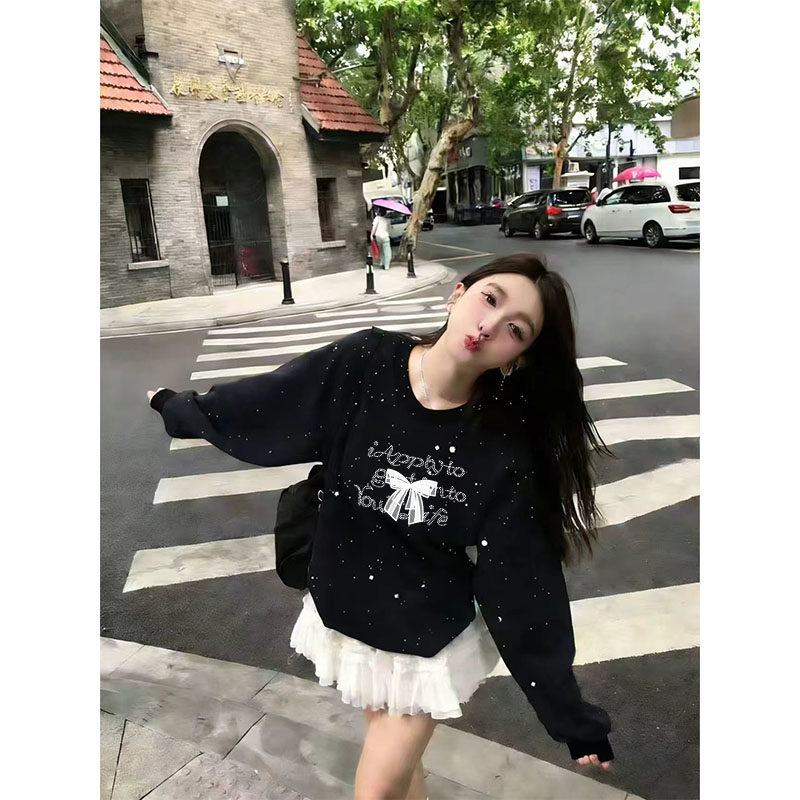 爆款复古圆领女款满天星亮片卫衣长袖中长款百搭韩版宽松显瘦上衣