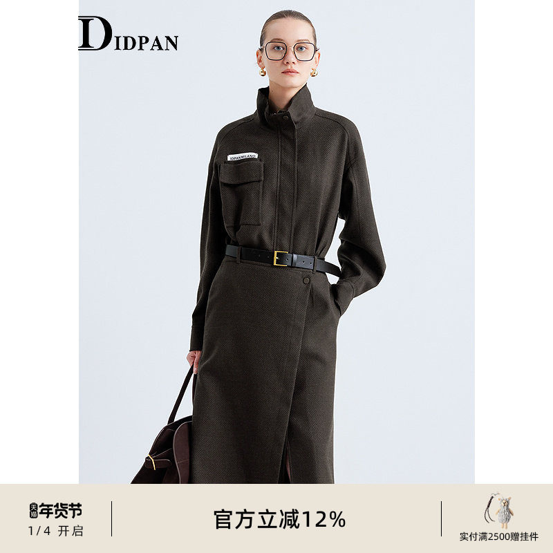 IDPAN羊毛外套式假两件连衣裙长裙个性廓形立领收腰裙子秋季新款