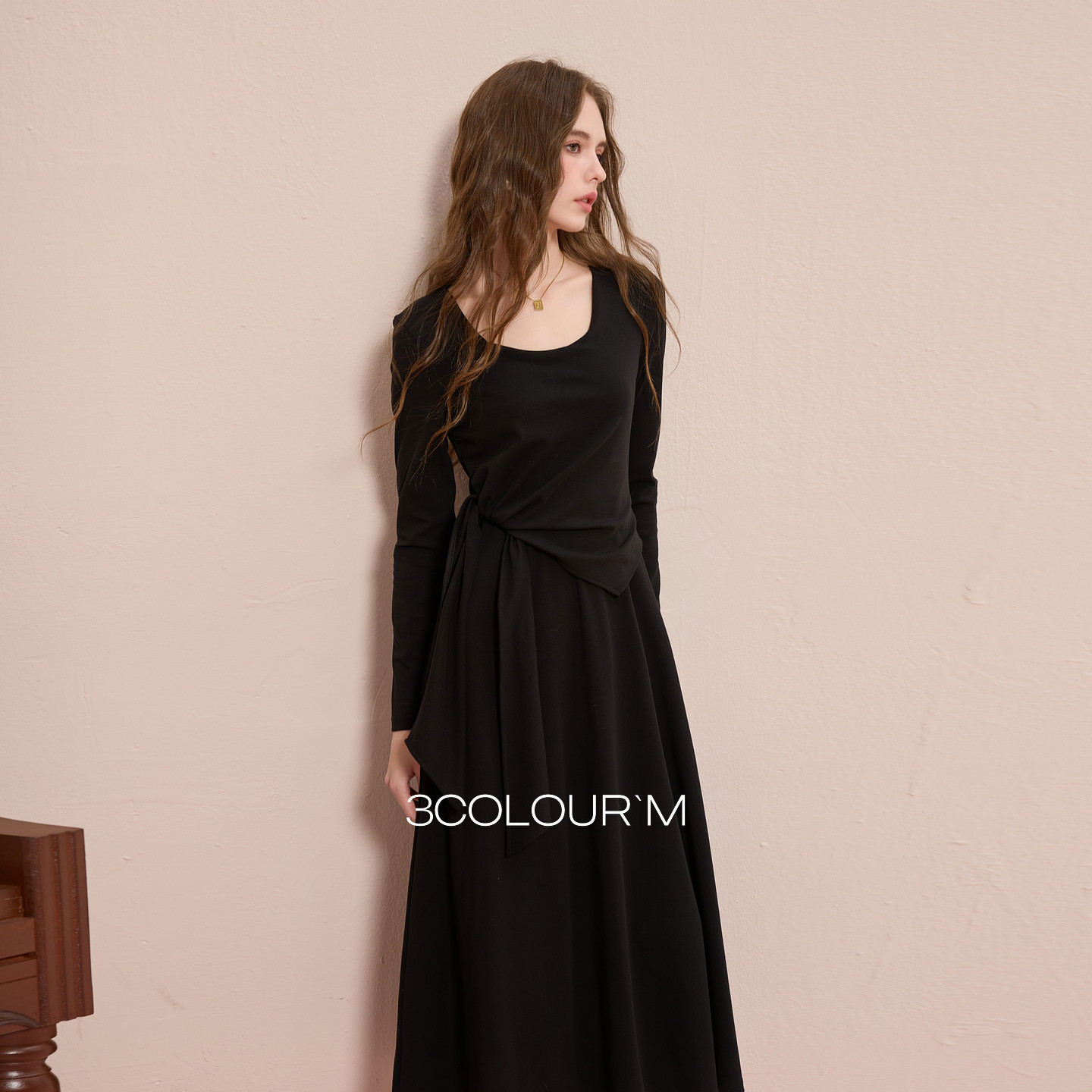 黑色长袖方领假两件挂脖连衣裙女高级感气质收腰长款针织拼接长裙