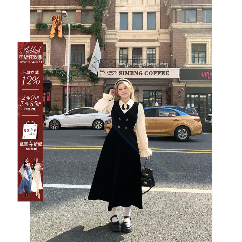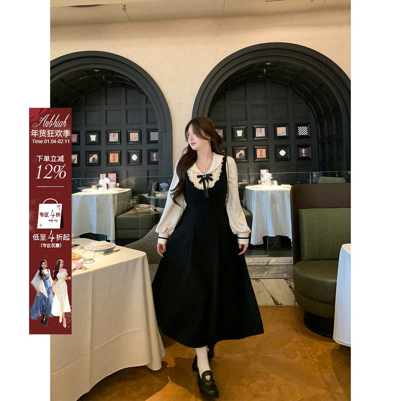安妮不火 学院风缎面娃娃领呢料连衣裙女微胖大码假两件收腰长裙
