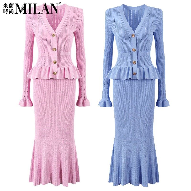 现货2026法式温柔风针织裙包臀鱼尾裙V领喇叭袖假两件连衣裙长裙