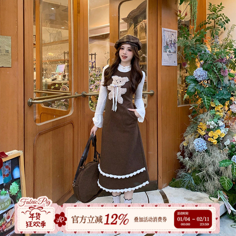 织物猪 枫糖撞奶 假两件长袖连衣裙女秋冬小熊千金感miu系长裙子