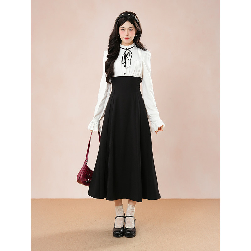 “缄" 法式中古风复古风穿搭2025秋气质收腰拼接假两件连衣裙长裙