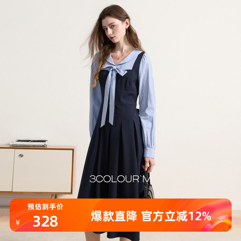 三彩2026春季新款条纹假两件连衣裙长袖系带收腰A字裙长裙M