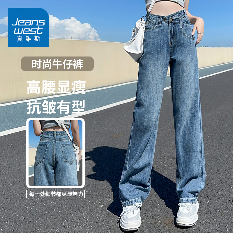 KZH真维斯不规则牛仔裤女春夏新款宽松直筒裤高腰显瘦阔腿长裤子
