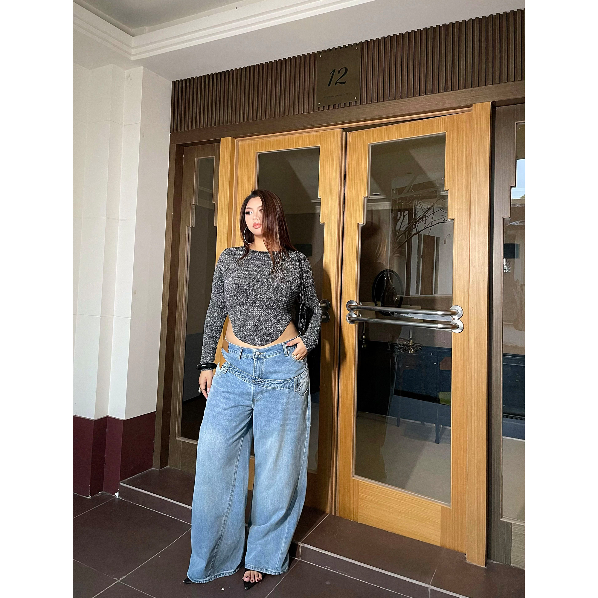 【明星同款】LEDIM WANG搭片不规则牛仔裤女款纯棉阔腿裤百搭长裤