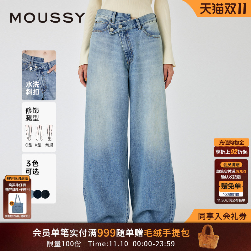 程潇同款MOUSSY 不规则设计感斜扣遮肚阔腿牛仔裤女010IAA11-6771