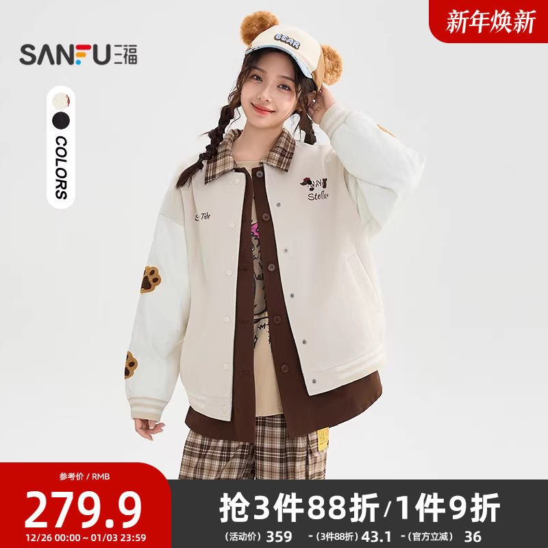 三福外套女2025新款冬季小狗绣花拼接皮质袖棒球服上衣女装509958