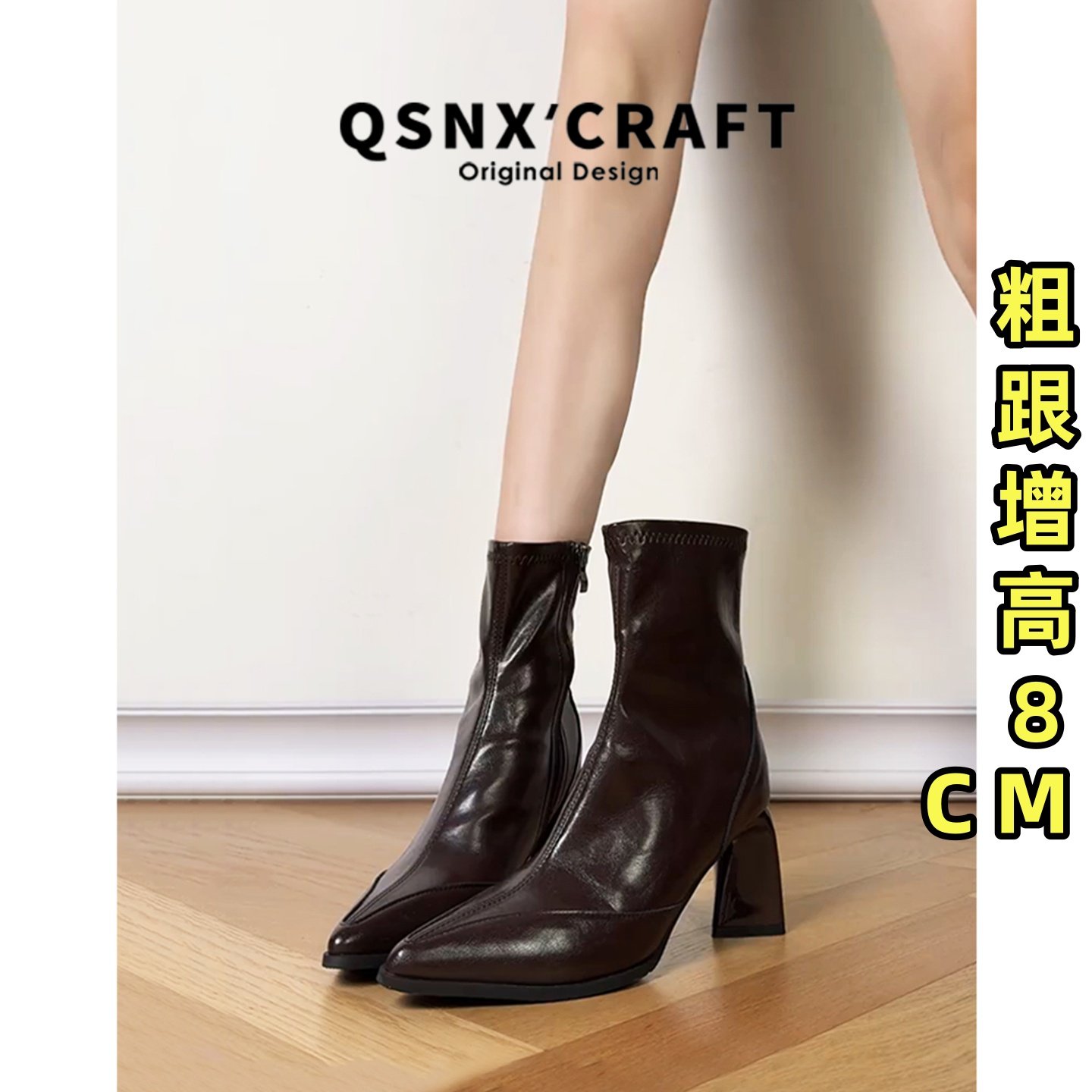 羊皮版~韩版尖头粗跟短靴女2025新款复古瘦瘦靴百搭棕色高跟靴子