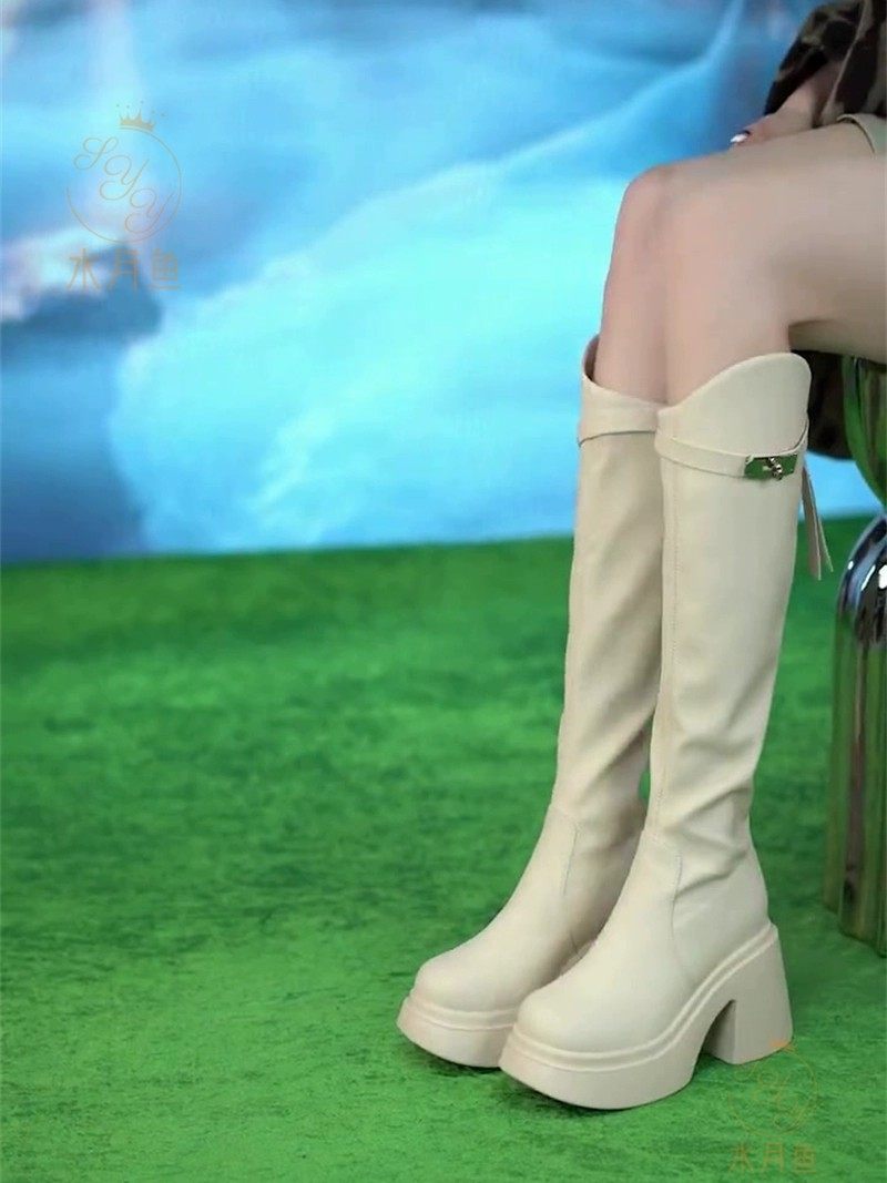 韩版时尚大筒围高跟骑士靴2025年春季圆头高筒长靴厚底粗跟时装靴