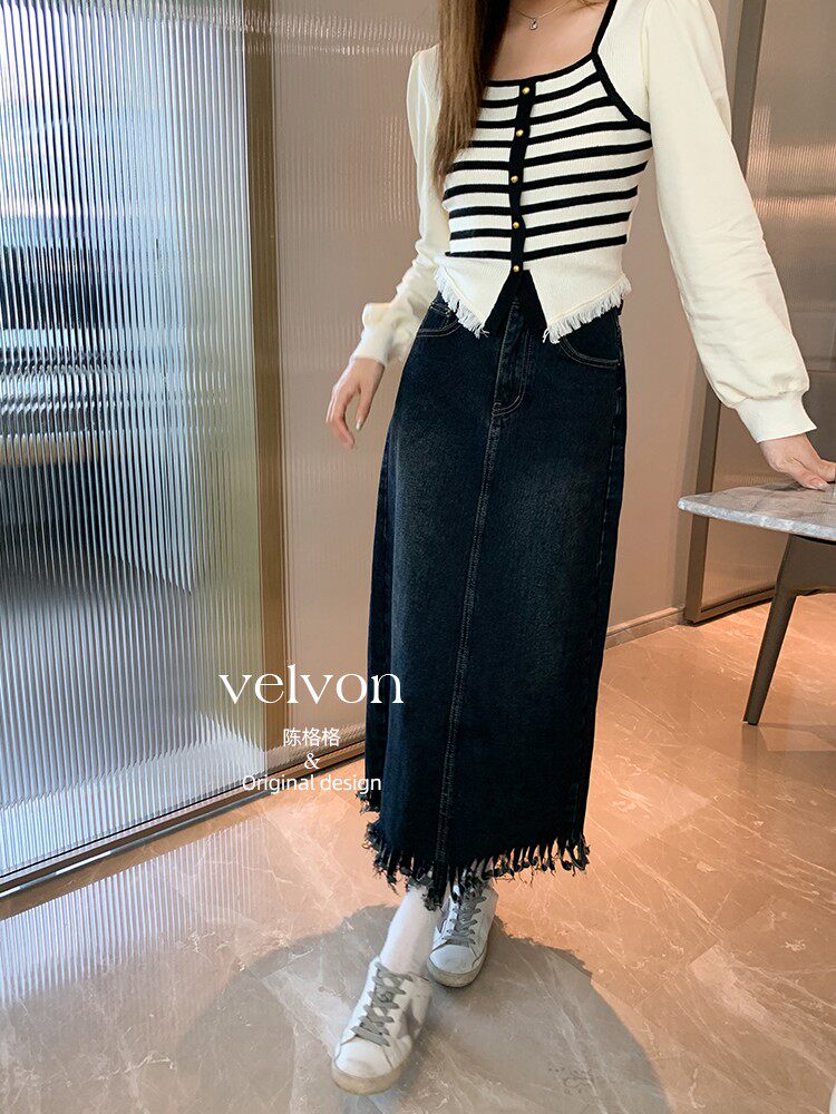 【陈格格】怪诞复古女士~高腰牛仔半身裙中长款流苏显瘦a字长裙