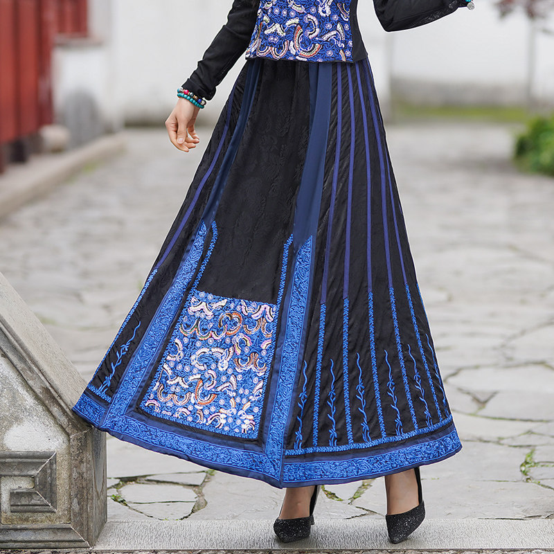 春夏中国风复古重工刺绣汉服改良半身裙 中长A字裙高腰百褶马面裙