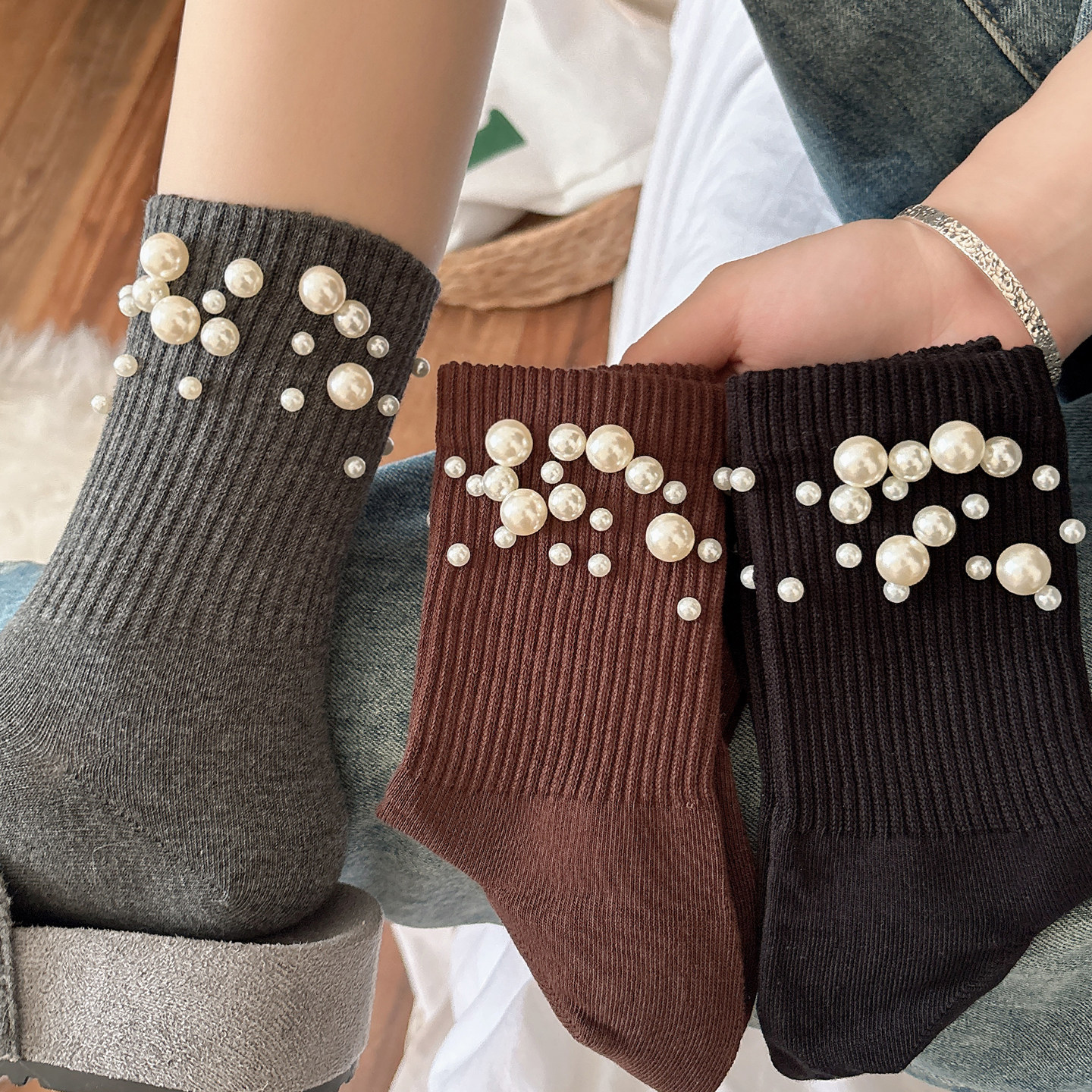 韩版创意个性设计感水钻珍珠袜子女中筒袜ins潮秋冬百搭时尚堆堆