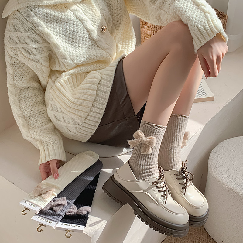 纯色百搭个性大蝴蝶结袜子女中筒袜粗条棉时尚韩版饰品女袜秋冬潮