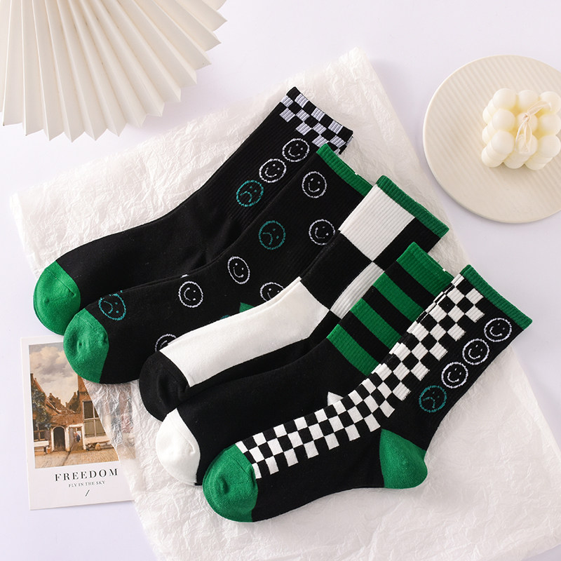 绿色格子袜子女中筒袜ins潮韩版长筒袜男百搭纯棉秋冬运动风个性