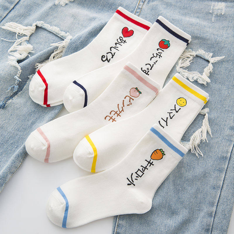 秋冬韩版英文刺绣中筒袜百搭爱心翻边时尚字母个性女袜潮流袜长袜