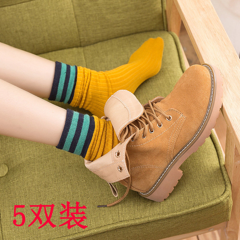 3双袜子韩版百搭个性条纹拼色中筒袜女秋冬季简约羊毛透气堆堆袜