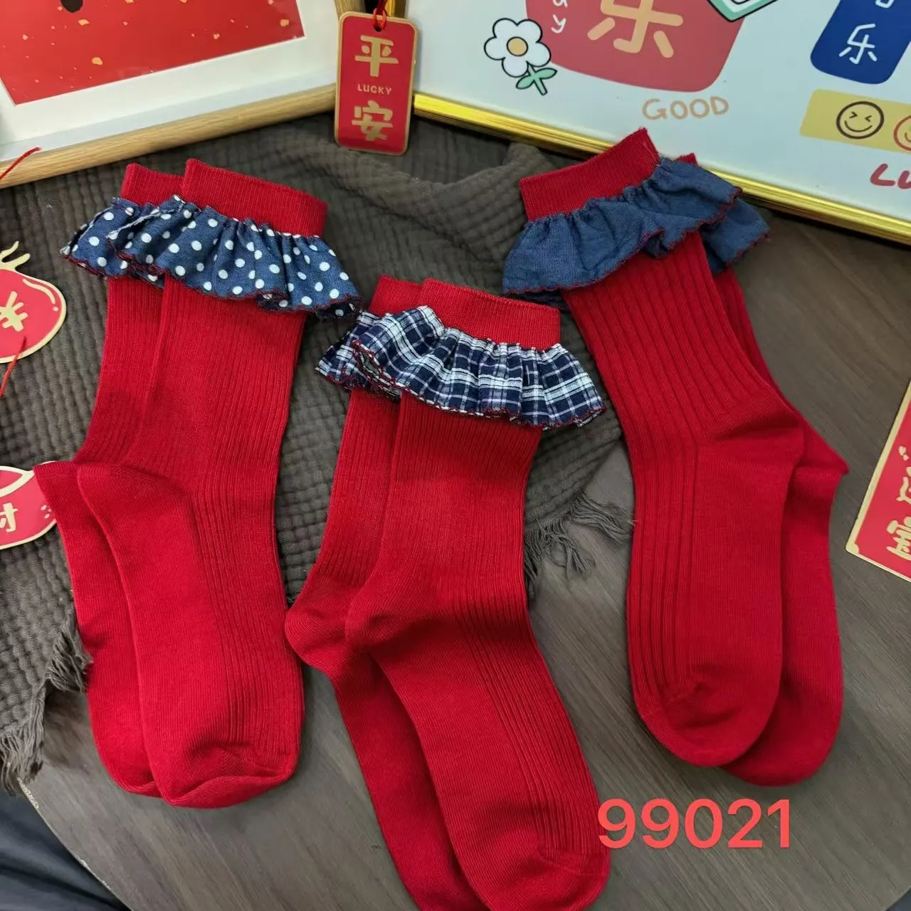 2026年秋冬新款本命年蓝色花边喜庆百搭个性潮流韩版红袜子女袜