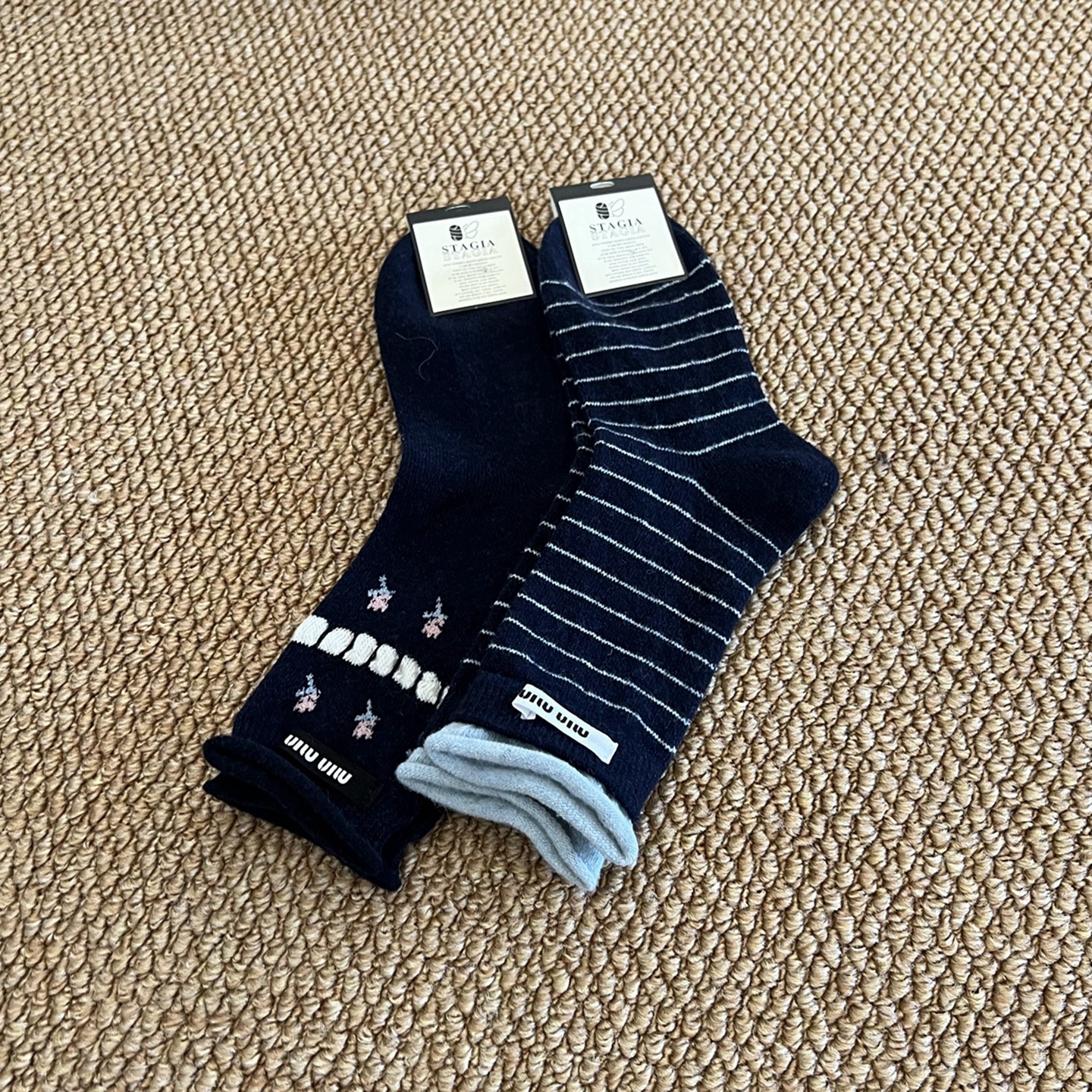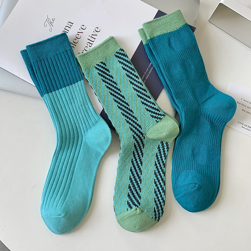 秋冬季蓝色系拼接袜子女双针中筒女袜韩版学院风个性百搭简约潮袜