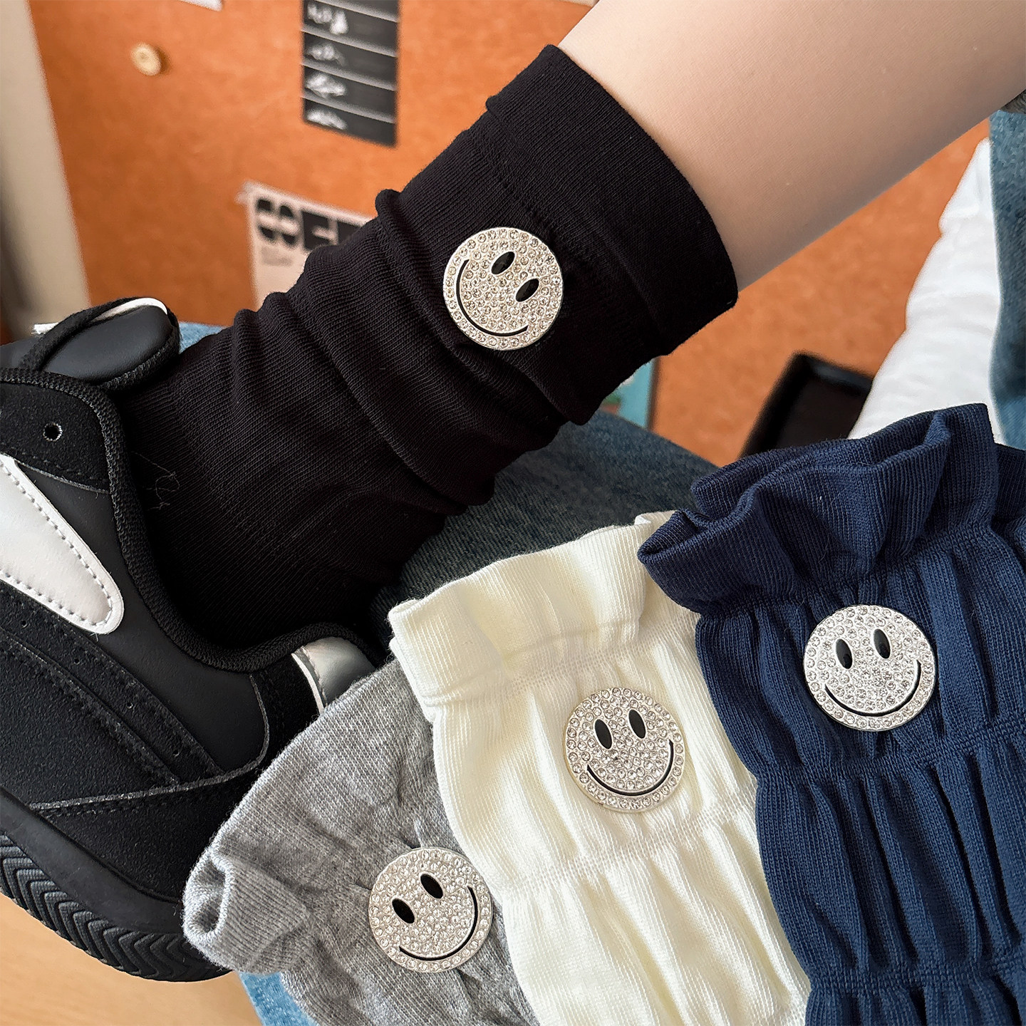 韩版个性合金水钻笑脸袜子女中筒袜秋冬时尚百搭扭扭袜堆堆长袜潮