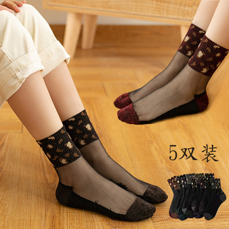 豹纹袜子女中筒银葱金银丝棉底水晶丝ins韩版秋冬豹点个性百搭潮w