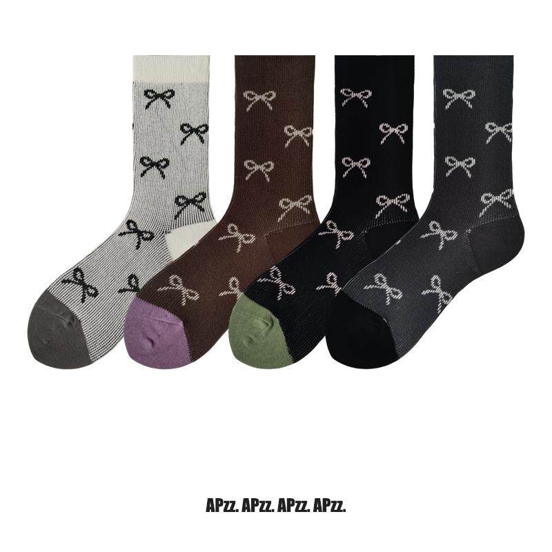 双针蝴蝶结袜子女个性拼色中筒袜秋冬韩版时尚百搭学院风堆堆长袜