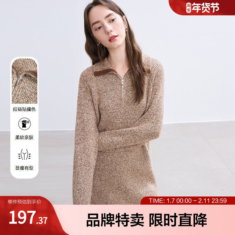OVVOutlet秋冬新款女装双色纱线半高领流苏装饰针织长袖连衣裙