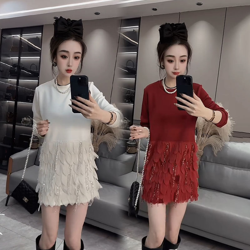 时尚洋气亮片流苏连衣裙2025冬季新款圆领拼接休闲宽松遮肉卫衣裙