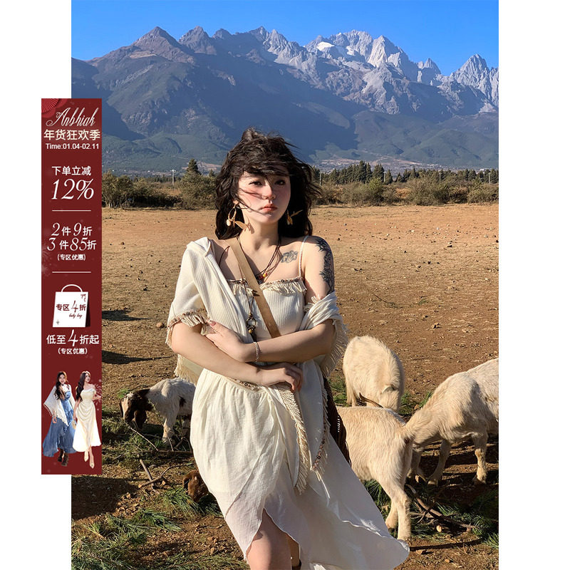 PAPERLLL辛间气质白色多层吊带连衣裙女夏羽毛流苏收腰中长款裙子