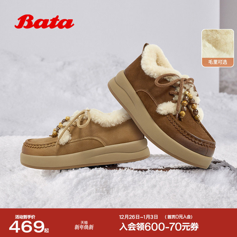 Bata勃肯加绒毛毛鞋女2025冬商场新款牛剖皮通勤保暖单鞋30922DM5