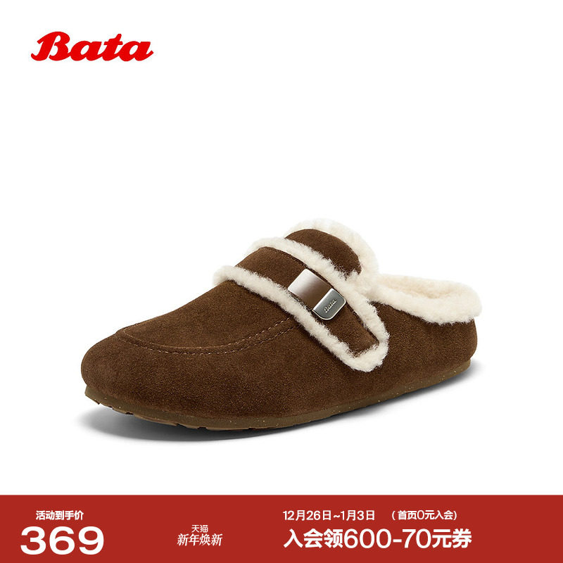 Bata勃肯毛毛鞋女2025冬新款英伦牛剖皮加绒保暖单鞋252MMDA5