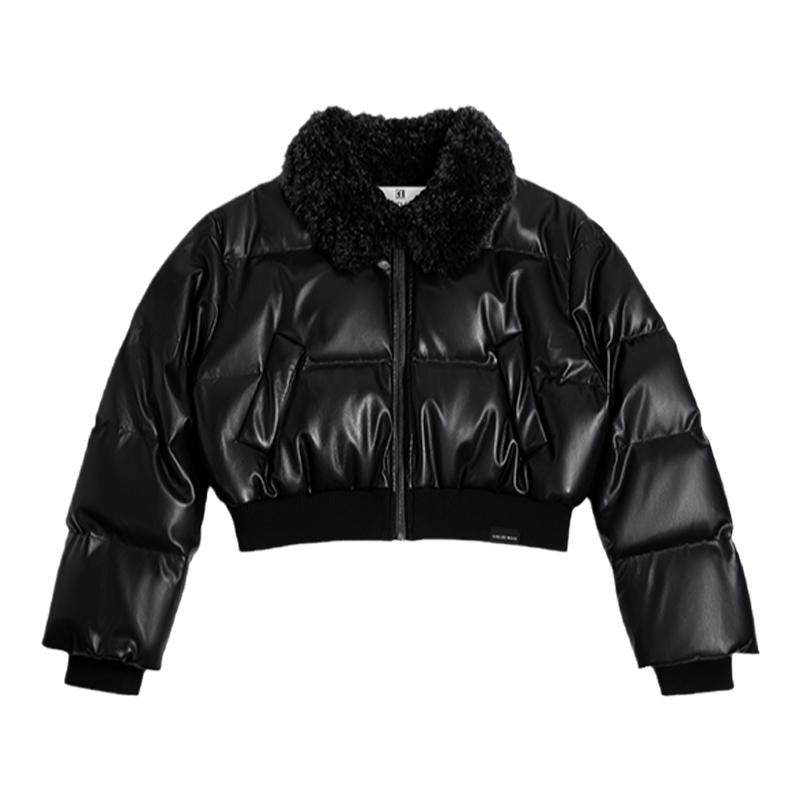 CALLEDBACK 黑色毛领亮面短款皮羽绒服女冬季高级感鹅绒夹克外套
