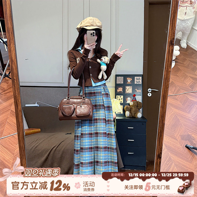 织物猪 小熊私塾 甜美学院风套装女秋假两件上衣格纹半身裙两件套