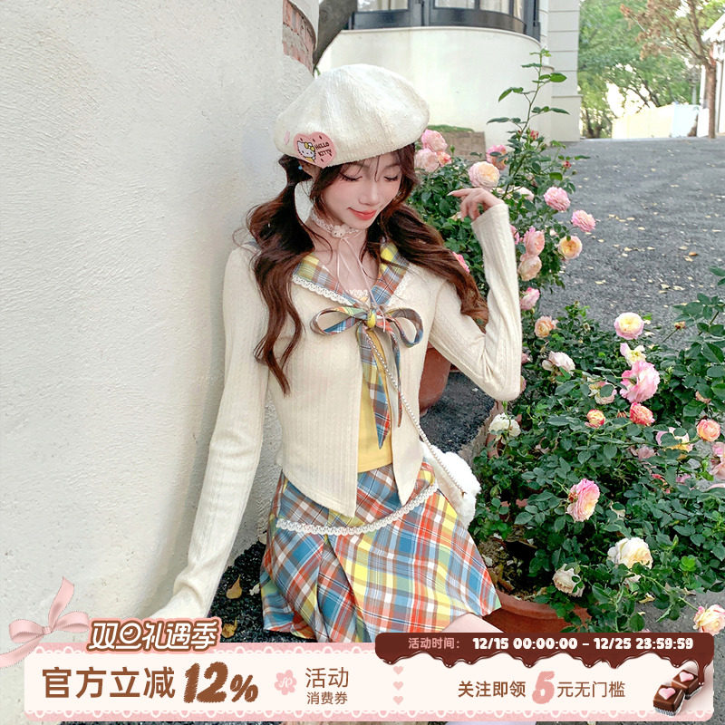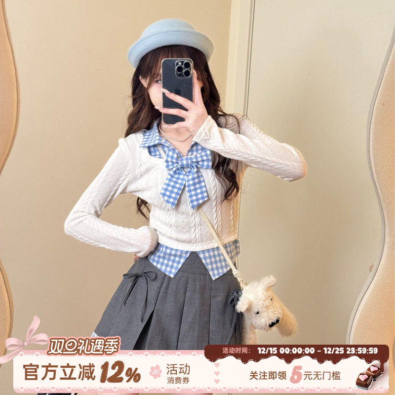 织物猪 巧可可高校 美拉德学院风套装假两件针织上衣女冬格纹短裙