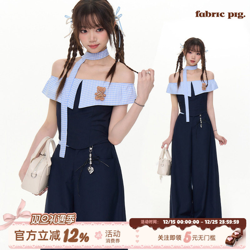 织物猪 航行日志 休闲学院风套装女夏拼接设计一字肩上衣阔腿长裤