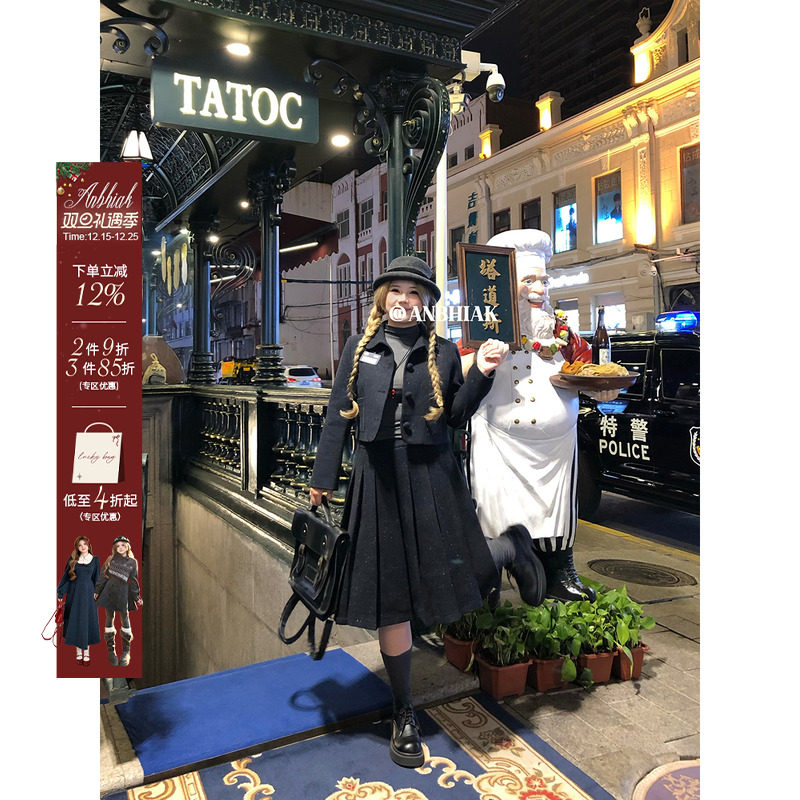 安妮不火 校供感彩点呢子外套+半裙套装女微胖大码气质学院风套装