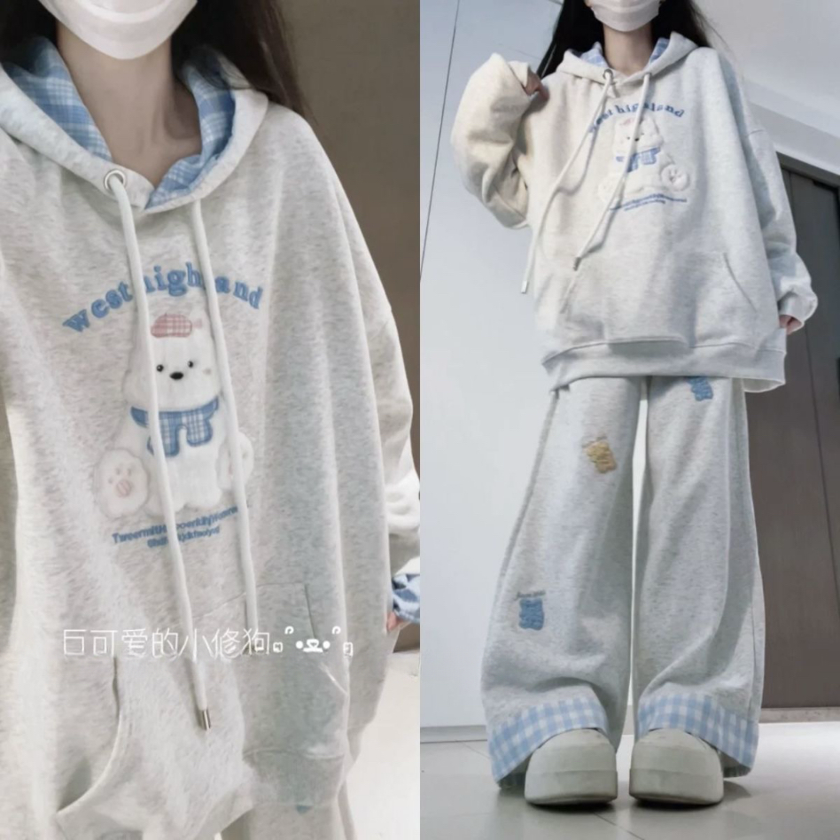 盐系学院风套装慵懒可爱假两件连帽卫衣刺绣小熊休闲阔腿裤两件套