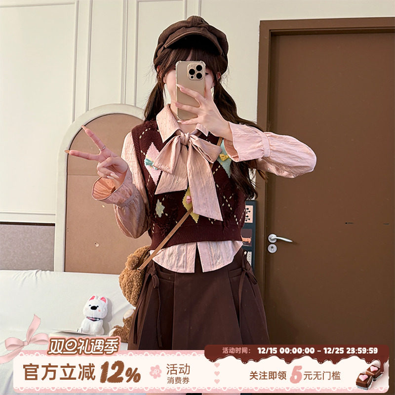 织物猪 风琴蓝调 学院风套装女秋粉色衬衫针织马甲背心短裙三件套