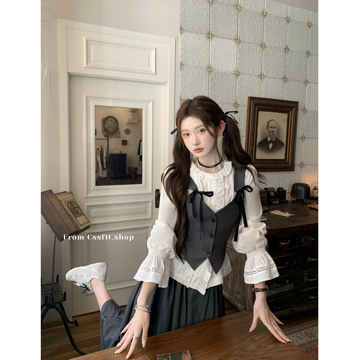 迟伞伞 半岛舞会 韩系灰马甲衬衫短裙长裙显瘦气质学院风套装女